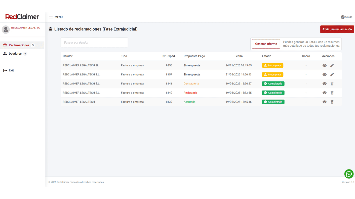 RedClaimer funciona como un software avanzado de cobrador de morosos, pensado para empresas y autónomos que necesitan control real. Desde un único entorno puedes: